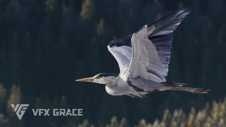 grey heron, heron, wader, ciconiiformes, bird, wing, feather, fly, animal, realistic, movie, Blender, Cycles