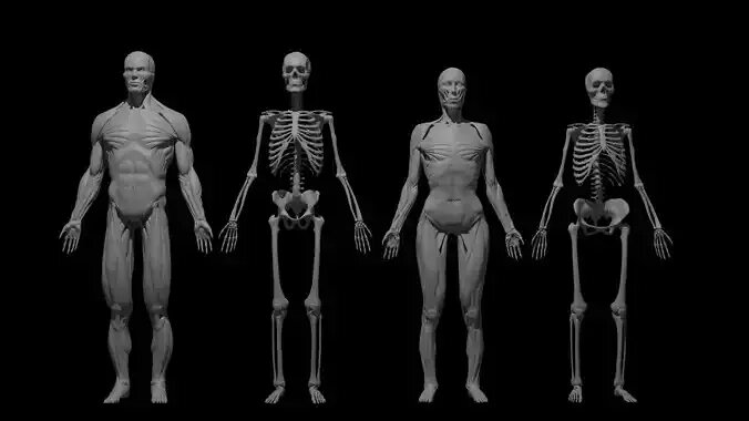 ZBrush (Native) | BLENDER (Scene file) | FBX– Female écorché (Low poly decimate) 72000 Polys– Female Skeleton (Low poly decimate) 72000 Polys– Female Eyes (With Uv’s) 5284 Polys– Male écorché (Low poly decimate) 72000 Polys– Male Skeleton (Low poly decimate) 72000 Polys– Male Eyes (With Uv’s) 5353 Polys
