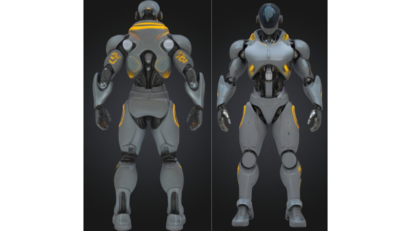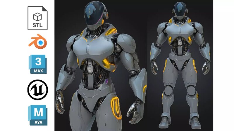 Visual Highlights:– Glossy gray armor with vibrant orange/yellow glow elements– Seamless blend between synthetic musculature and hard plating– Helmeted head with sleek visor faceplate– Ideal for sci-fi projects, robotic NPCs, cyberpunk environments, or tech demos