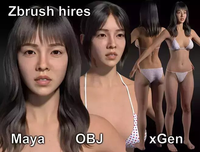 This model can be used as a base for any asian and none asian female characters. It has clean animation friendly topology and UV's.It is a great base for Your projects that can save You a lot of time. Even the hair xGen setup is made in the way that allows You to modifiy the modelshape in zbrush and still use provided hair setup just by using blend shape.There is also eyes and teeth and tongue models with maps and source hires ztl. All You need for character setup.