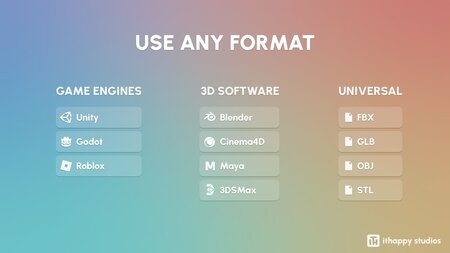 You’ll be able to download formats such as Unity Package, UE, Blender, C4D, Maya, 3DSMax, FBX, OBJ, GLTF, and STL.