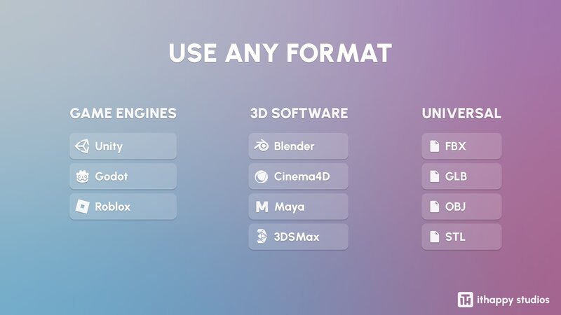 You’ll be able to download formats such as Unity Package, UE, Blender, C4D, Maya, 3DSMax, FBX, OBJ, GLTF, and STL.