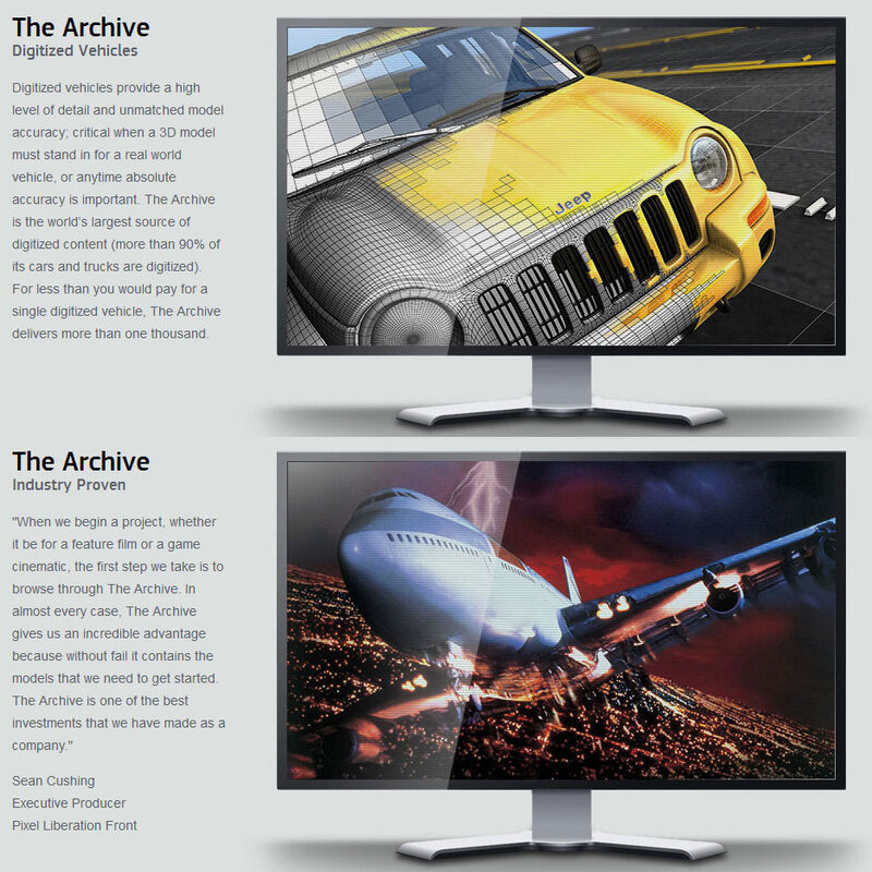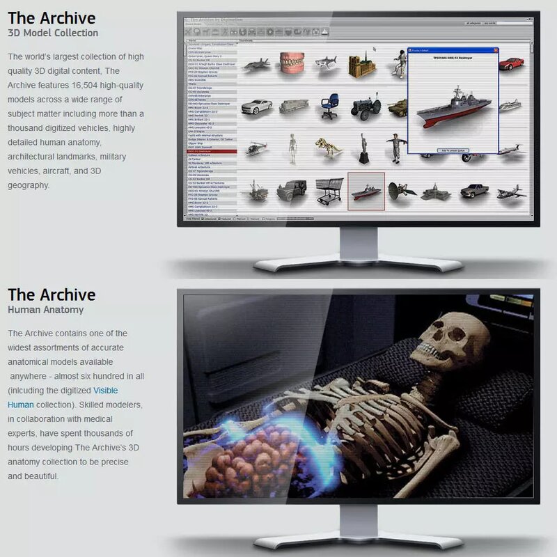 As the world’s largest collection of high quality 3D digital content, The Archive features 16,504 high-quality models across a wide range of subject matter including more than a thousand digitized vehicles, highly detailed human anatomy, architectural landmarks, military vehicles, aircraft, and 3D geography.