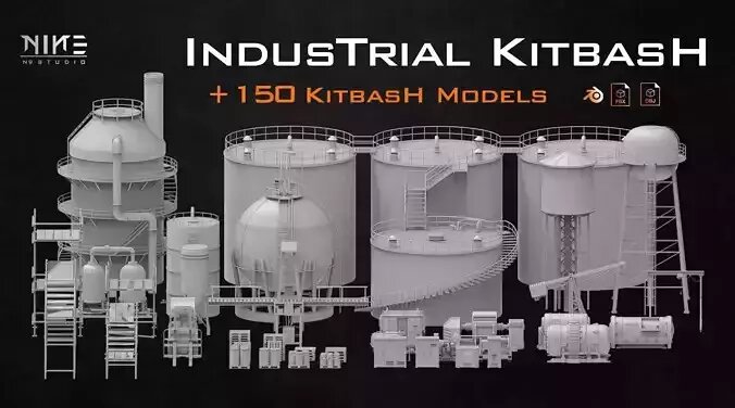 There are more than 150 different base meshes of Industrial Kitbash including storage tanks, generators, industrial machines, switches, room equipment, utility boxes, scaffolding, water tanks, and more for you to easily use in your projects.
