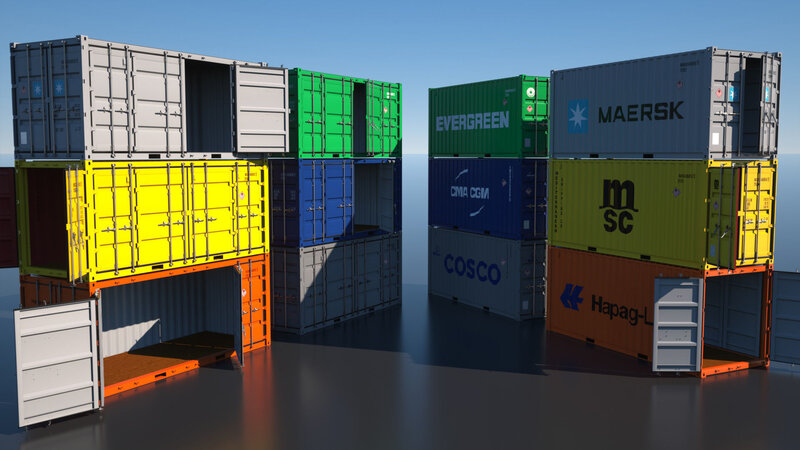 • All 6 textures are included in PSD files one for inside and one for inside. ( MSC, COSCO, CMA-CGM, EVERGREEN, Hapag-Lloyd, Maersk). Easy to load your own textures and logos in few clicks.