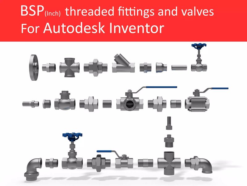 The CAD library:44 Different types of BSP threaded fittings and valves, in full range diameters, are included in this full range 3D CAD library. That means: many hundreds of high quality 3D models for your piping designs...■ Premium quality CAD models■ High grade of detail■ Technical data within the models: all relevant Iproperties are filled in■ Designed by Dutch mechanical engineers■ All main dimensions included (PDF)The 3D models:■ Globe valves■ Ball valves■ Gate valves■ Check valves■ Needle valves■ Strainers■ Sockets■ Elbows■ Unions■ Hose adaptors■ Reducers■ FlangesAnd much more!