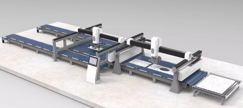 This machine is an industrial 5-axis bridge-type CNC router designed for cutting and processing materials like stone or marble. It is equipped with conveyor belt systems to facilitate the quick loading and unloading of workpieces. The processing area is managed by a high-precision cutting head mounted on the bridge at the top of the machine. An automated control panel allows for easy management of operations. This setup is suitable for industrial-scale production, supporting the processing of large and precise materials.